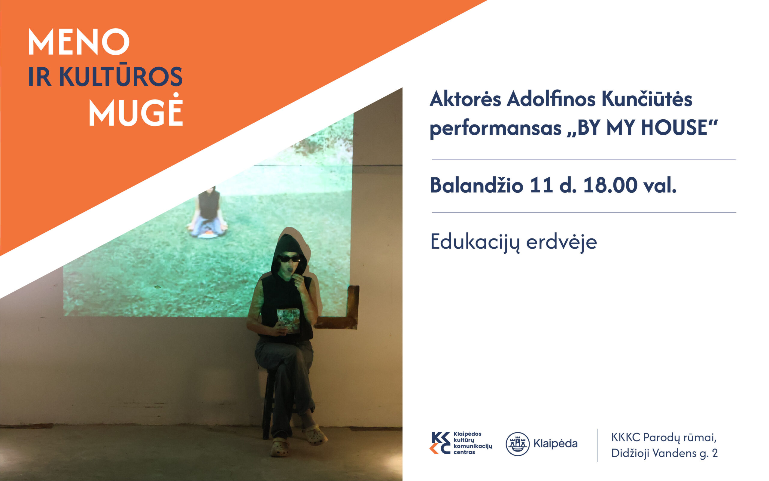 Balandžio 11 d. 18.00 val. Klaipėdos kultūrų komunikacijų centro (KKKC) Parodų rūmuose (Didžioji Vandens g. 2) Meno ir kultūros mugės Edukacijų zonoje vyks performansas „by my house“, kurį atliks aktorė Adolfina Kunčiūtė. Jis buvo sukurtas reziduojant Kolumbijoje meno ir kultūros centre „ArteSumapaz“.