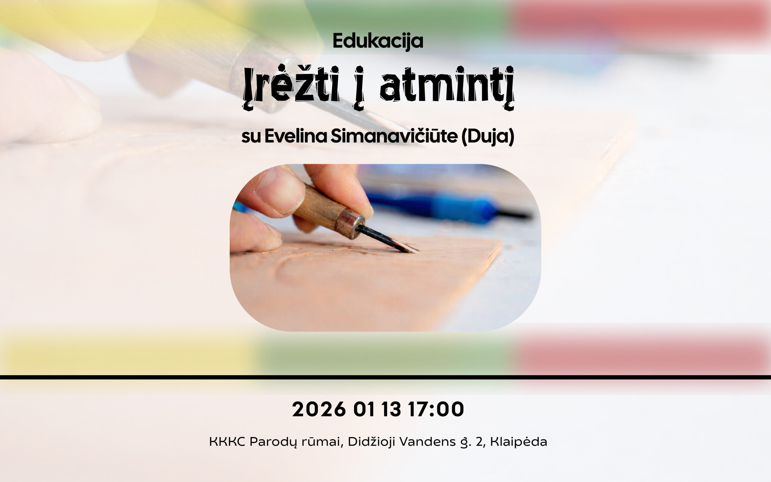 Sausio 13 d., antradienį, 17.00 val. Klaipėdos kultūrų komunikacijų centro (KKKC) Parodų rūmuose vyks edukacija „Įrėžti į atmintį“ su Evelina Simanavičiūte (Duja).