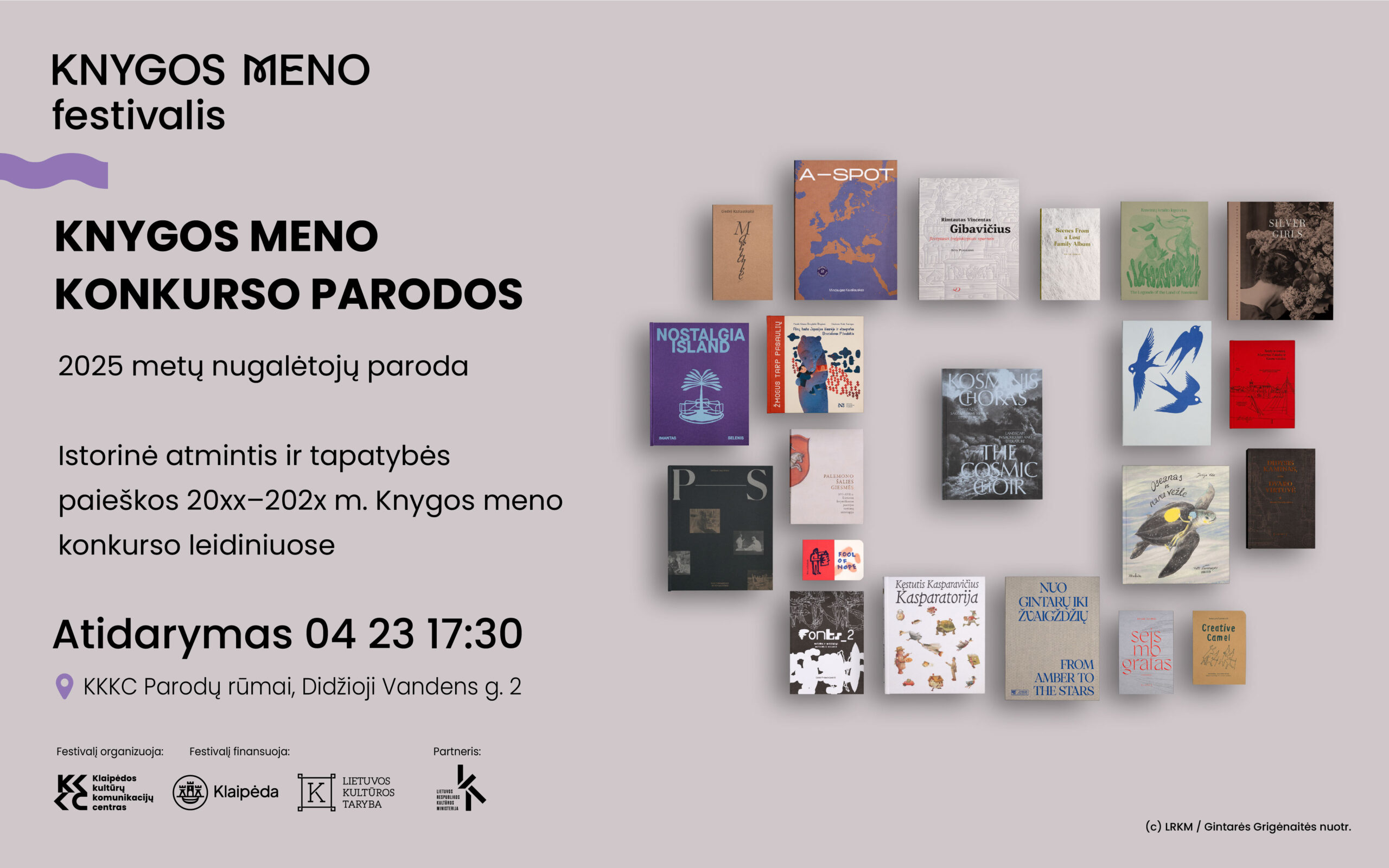 Balandžio 23 d., ketvirtadienį, 17.30 val. Klaipėdos kultūrų komunikacijų centro (KKKC) Parodų rūmuose (Didžioji Vandens g. 2) atidaromos Knygos meno konkurso parodos: 2025 metų nugalėtojų paroda bei paroda „Istorinė atmintis ir tapatybės paieškos 20xx–202x m. Knygos meno konkurso leidiniuose“. Parodos vyks iki birželio 7 d. ir yra Knygos meno festivalio dalis.