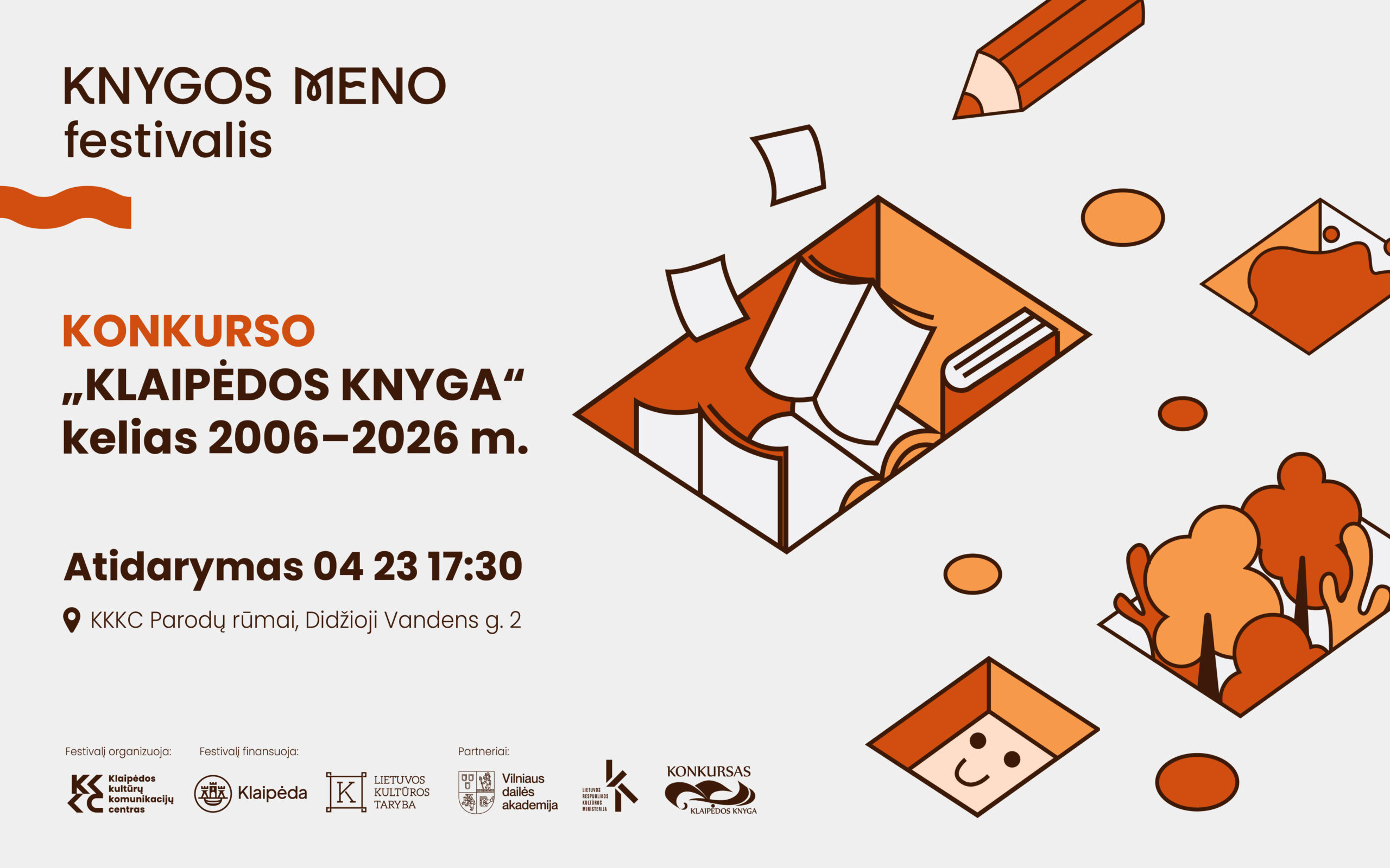 Balandžio 23 d., ketvirtadienį, 17.30 val. Klaipėdos kultūrų komunikacijų centro (KKKC) Parodų rūmuose (Didžioji Vandens g. 2) atsidaro knygų paroda „Konkurso KLAIPĖDOS KNYGA kelias 2006–2026 m.“. Paroda vyks iki birželio 7 d. ir yra Knygos meno festivalio programos dalis.