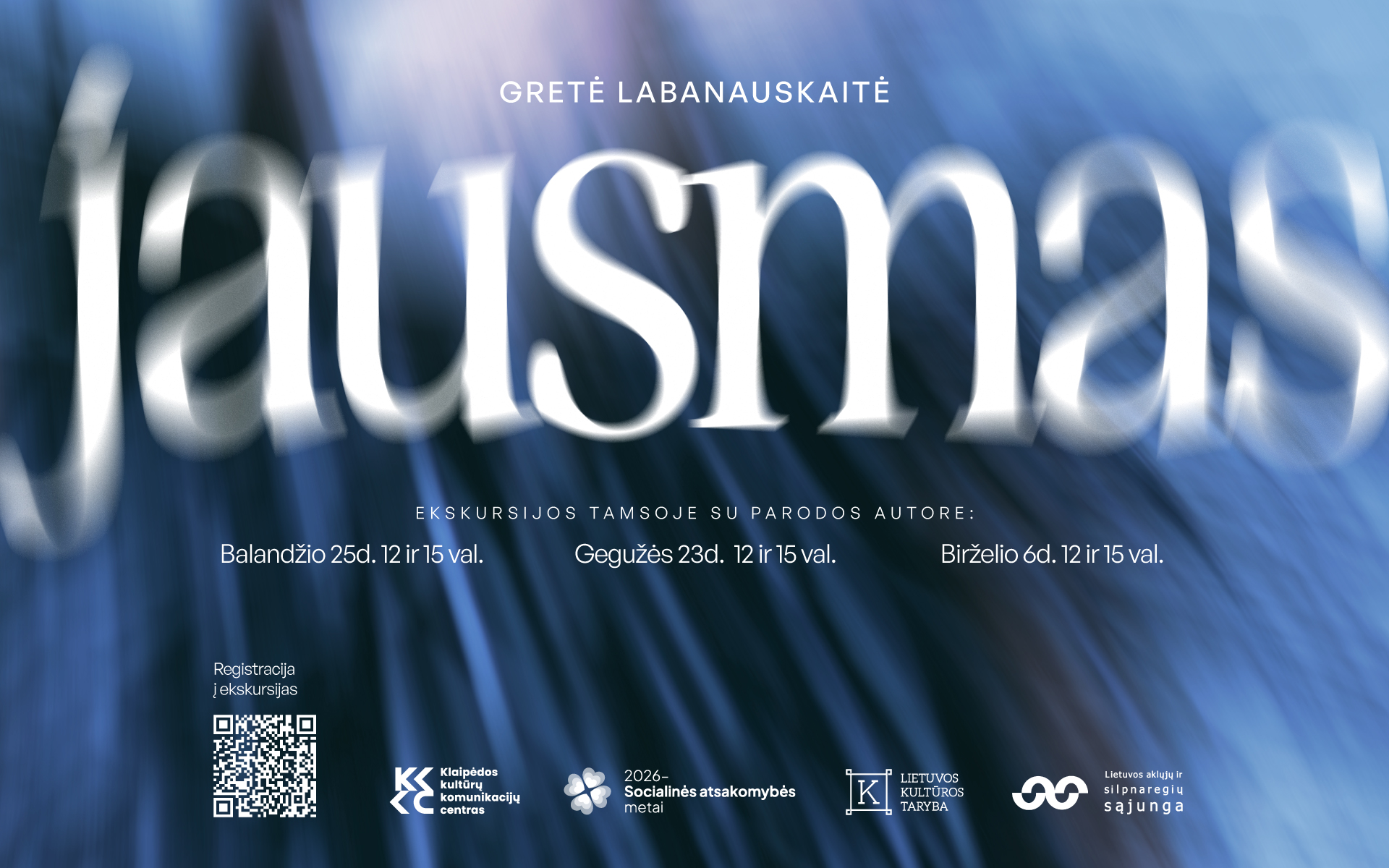 Balandžio 25 d., gegužės 23 d., birželio 6 d. 12.00 val. ir 15.00 val. Klaipėdos kultūrų komunikacijų centro (KKKC) Parodų rūmuose (Didžioji Vandens g. 2) vyks patirtinės ekskursijos parodoje „Jausmas“, kurias ves parodos autorė Gretė Labanauskaitė.